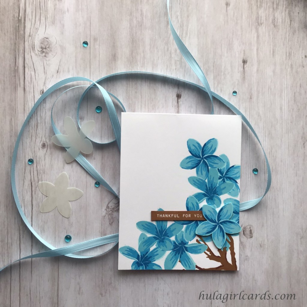 Finishing touches for this card include a dimensional, fussy cut plumeria blossom adhered to foam dots and the “thankful for you” sentiment from Altenew’s Best Sentiments stamp set. This sentiment was backed with an extra layer of cardstock so that it stood out from the card front, but also fit neatly under the dimensional plumeria. The sentiment’s edges were slid along the Milk Chocolate ink pad, creating a seamless look where white edges might otherwise have interrupted the flow of the overlapping plumeria flowers. Milk Chocolate was also used for the plumeria tree’s branches along with the Dark Chocolate Artist Marker for added shading.