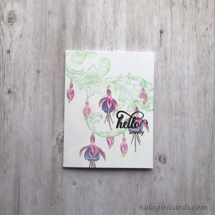 The vibrant card’s “you inspire me” sentiment, from Altenew’s Painted Butterflies stamp set, was stamped in Altenew’s Ultraviolet ink, which is from the same color family used for the purple portion of the blossoms. Backed with two additional layers of cardstock, this sentiment almost trails off the final swoop of the lower vine, but instead emphasizes its curve towards the centermost fuchsia blossom. The lighter variation’s sentiment, “hello lovely,” from Altenew’s Fancy Greeting stamp set, was stamped with Altenew’s Obsidian Black Pigment Ink and is the boldest feature on the card, drawing the eye to the triangular trio of fully blooming fuchsia.