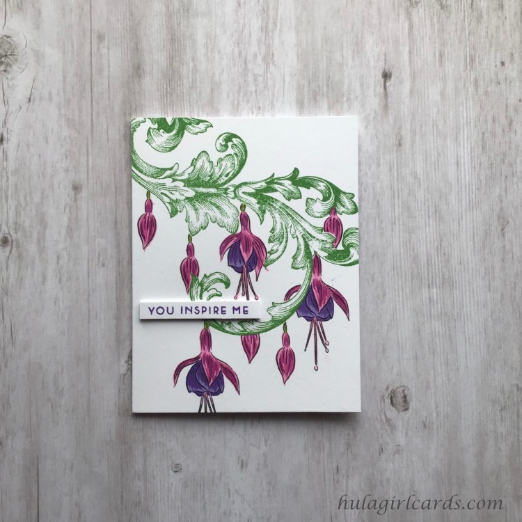 Sometimes, a card takes a romantic turn, leaving botanical accuracy in its wake. Such was the case with today’s card, inspired by the AECP course All About Layering 2, with its fuchsia blossoms and buds nestled amongst vining leaves.