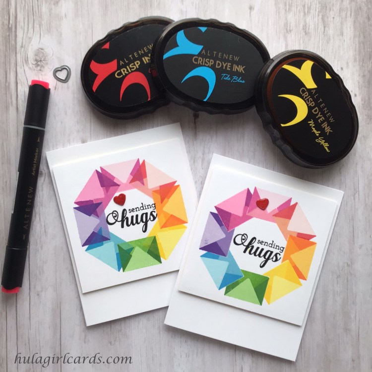 Finishing details for these cards include an accent heart and foam-sheet elevated focal image. The heart, cut with the die included in the Snail Mail die set, was colored with the Ruby Red Artist Marker prior to applying Nuvo Aqua Shimmer and Glossy Accents. This shiny heart pairs nicely with the “Sending Hugs” sentiment from Altenew’s Fancy Greetings stamp set. The deep black sentiment was stamped using Altenew’s Obsidian Pigment Ink.