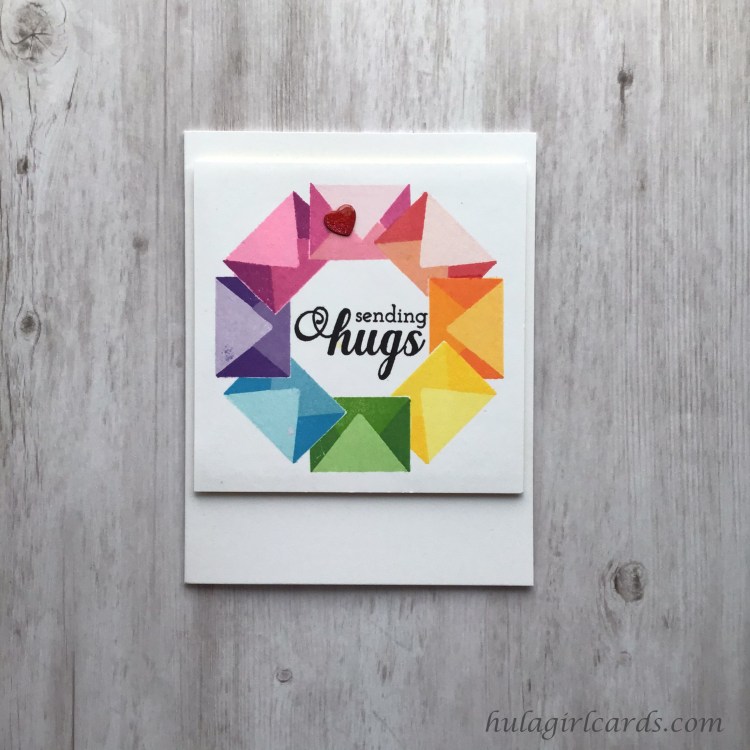 If masking sounds like entirely too much work, you needn’t fear. The overlapping stamping in the above example is just as beautiful as the masked wreath. These colors blend and transition from one to the next, creating the look of tinted, translucent envelopes. This card variation can be stamped by rotating either clockwise or counter-clockwise since masking is not an issue.