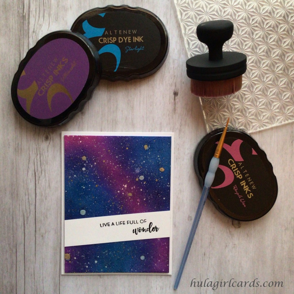 Images of nebulae, particularly that of the Orion Nebula with its pink and purples hues, helped in deciding the card’s palette. Altenew’s Crisp Dye Ink colors of Purple Wine, Starlight, and Ultraviolet were chosen to create the atmosphere of looking out from within the nebula. Using Altenew’s Crafter’s Essential Stamping Mat and Pink & Main’s Ergonomic Blending Brush, large swaths of blue were applied to the card front. Since Starlight covers the largest area, it was necessary to angle the blending brush and use a sweeping motion to blend pink and purple in the remaining, narrow spaces, creating a subtle blend.