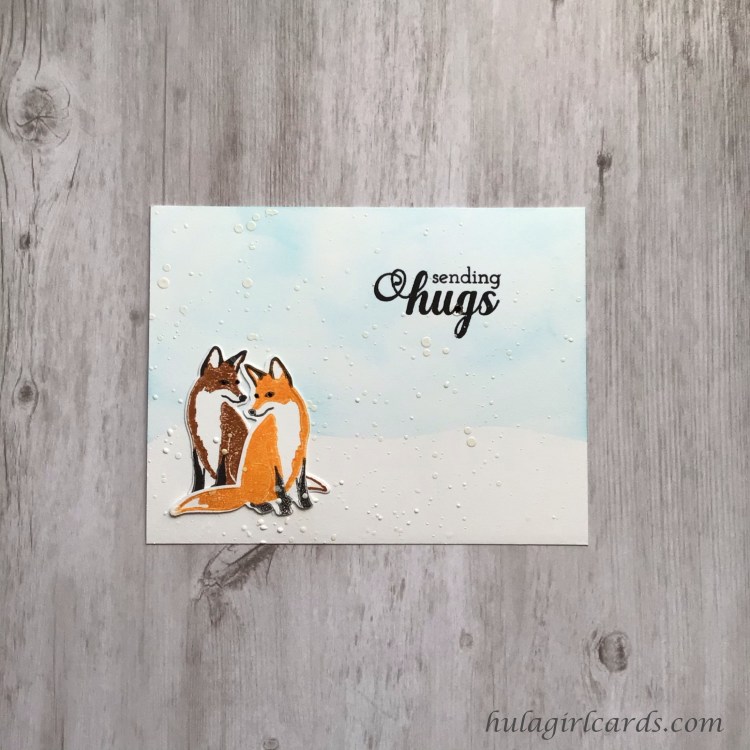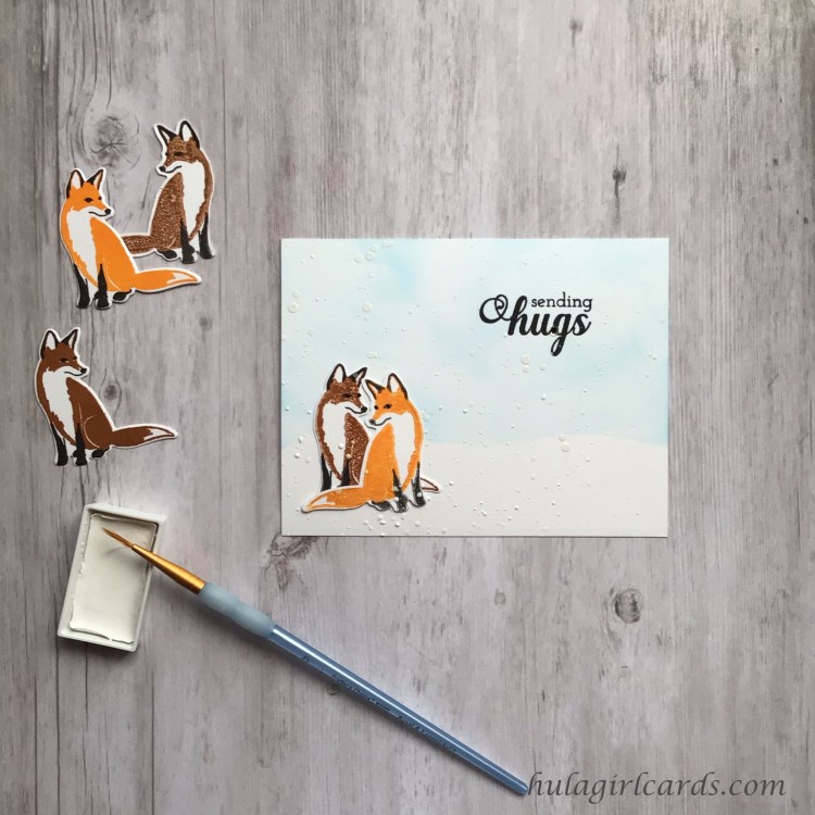 After removing the mask, the fox die cuts were adhered to the card front so that they face one another and overlap, suggesting an embrace. Snowflakes were added by sprinkling white paint from Kuretake’s Gansai Tambi Watercolor Palette. A heavier concentration was sprinkled around the foxes to create the sense of time, which when combined with the “Sending Hugs” sentiment from Altenew’s Fancy Greetings Stamp Set underscores the length of the encouraging embrace despite the winter snow.
