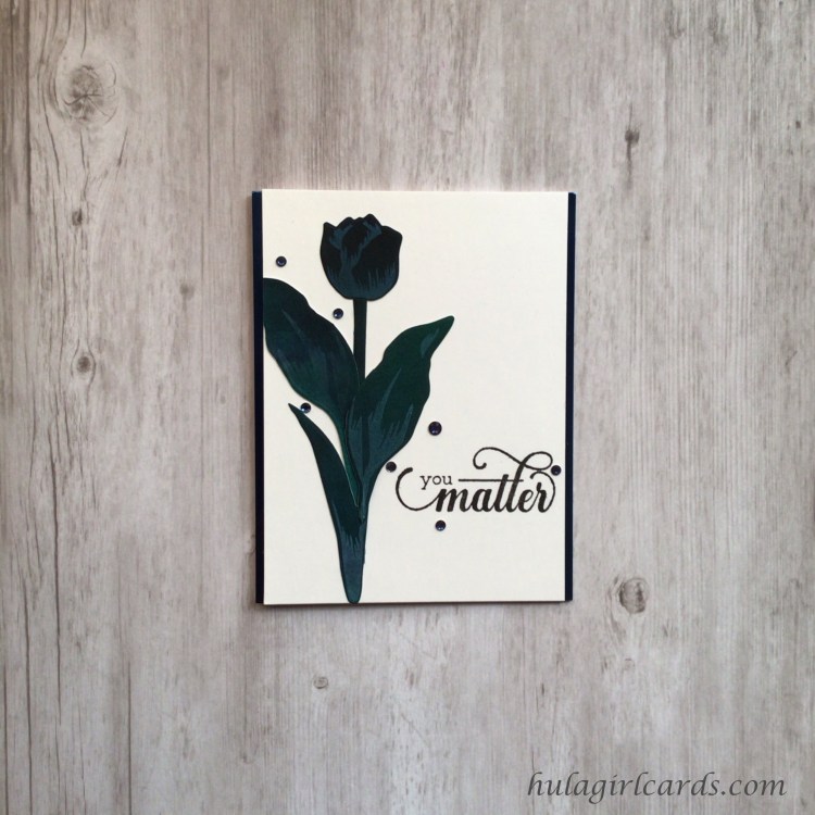 Stamped with Altenew’s Obsidian Pigment Ink, the sentiment “you matter” from their Fancy Greetings stamp set occupies the lower third of the card beside the flower. The card front was trimmed to 4″ x 5.5″ and glued on top of thin border strips of dark blue mirror cardstock, which highlights the deep blue tones in the watercolor. Midnight blue rhinestones were added in a diagonal, triangular placement, cascading down the tulip and around the sentiment.