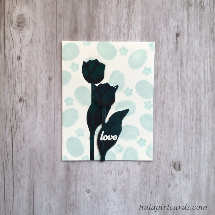 To build the flower, the straight stem was adhered to the blossom, and the height of the resulting unit was auditioned on the card front and glued into place. Then, three leaf die-cuts were layered on top of the stem, effectively lengthening the flower unit. Alterations, such as trimming stems and shading layered areas with pigment ink, were made as needed until a full tulip stalk emerged.