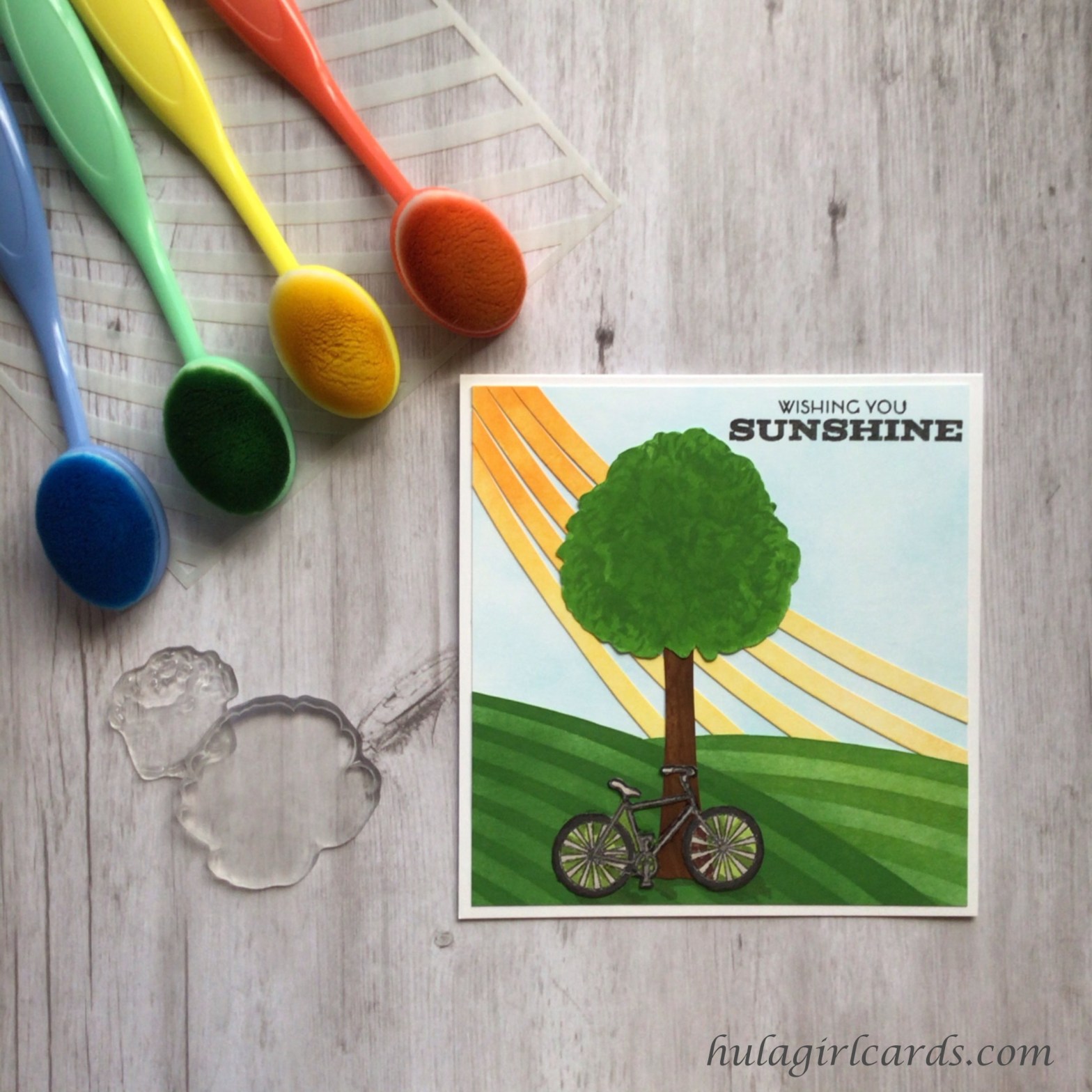 Imaginative use of stamps and stencil yield a charming, outdoor scene appropriate for any cycling enthusiast.
